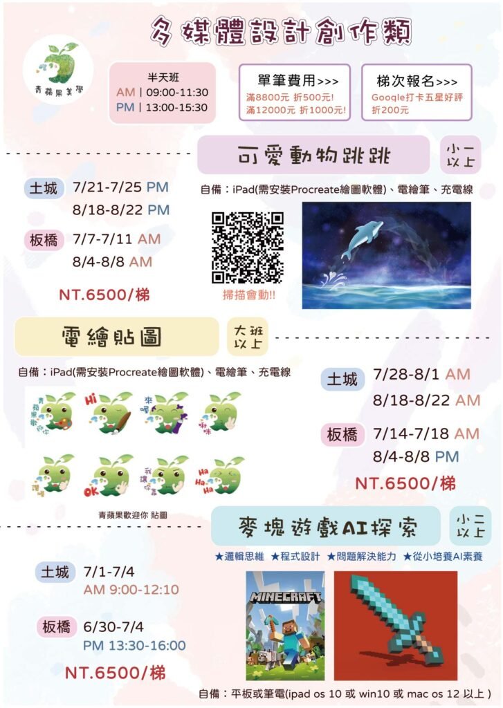 2025 藝 術 夏 令 營 – 《 多媒體設計創作 》 by 青 蘋果 | 5 月 1, 2025 | 蘋果網誌我來說 《C電繪類》 多媒體設計創作類 ✧課程介紹: 只要一台IPAD,老師帶你創造科技的趣味。 適齡:國小低年級以上 ★可愛動物跳跳營 ★電繪LINE貼圖 ★麥塊遊戲設計 歡迎詢問土城櫃檯-粉圓老師02-22631570 板橋櫃檯-奶茶老師 02-22721557 #土城畫室#板橋畫室#青蘋果美術#幼兒美術#兒童美術