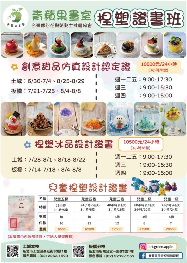 2025 藝 術 夏 令 營 – 《 捏塑證書班 》 by 青 蘋果 | 5 月 1, 2025 | 蘋果網誌我來說 《B證書類》 專業黏土證書:手把手個別指導 ✧課程介紹:由台灣麵包花與紙黏土推展協會認證合格教師個別指導,協會證書已配合108課綱之「全國高級中等學校學生學習歷程資料庫」登錄。 ✧ 完成作品皆由畫室協助送審 ●【捏塑證書類 】 ★創意甜品仿真設計 ★捏塑冰品設計 ★兒童捏塑設計(五/四/三/二/一級) 歡迎詢問土城櫃檯-粉圓老師02-22631570 板橋櫃檯-奶茶老師 02-22721557 #土城畫室#板橋畫室#青蘋果美術#幼兒美術#兒童美術
